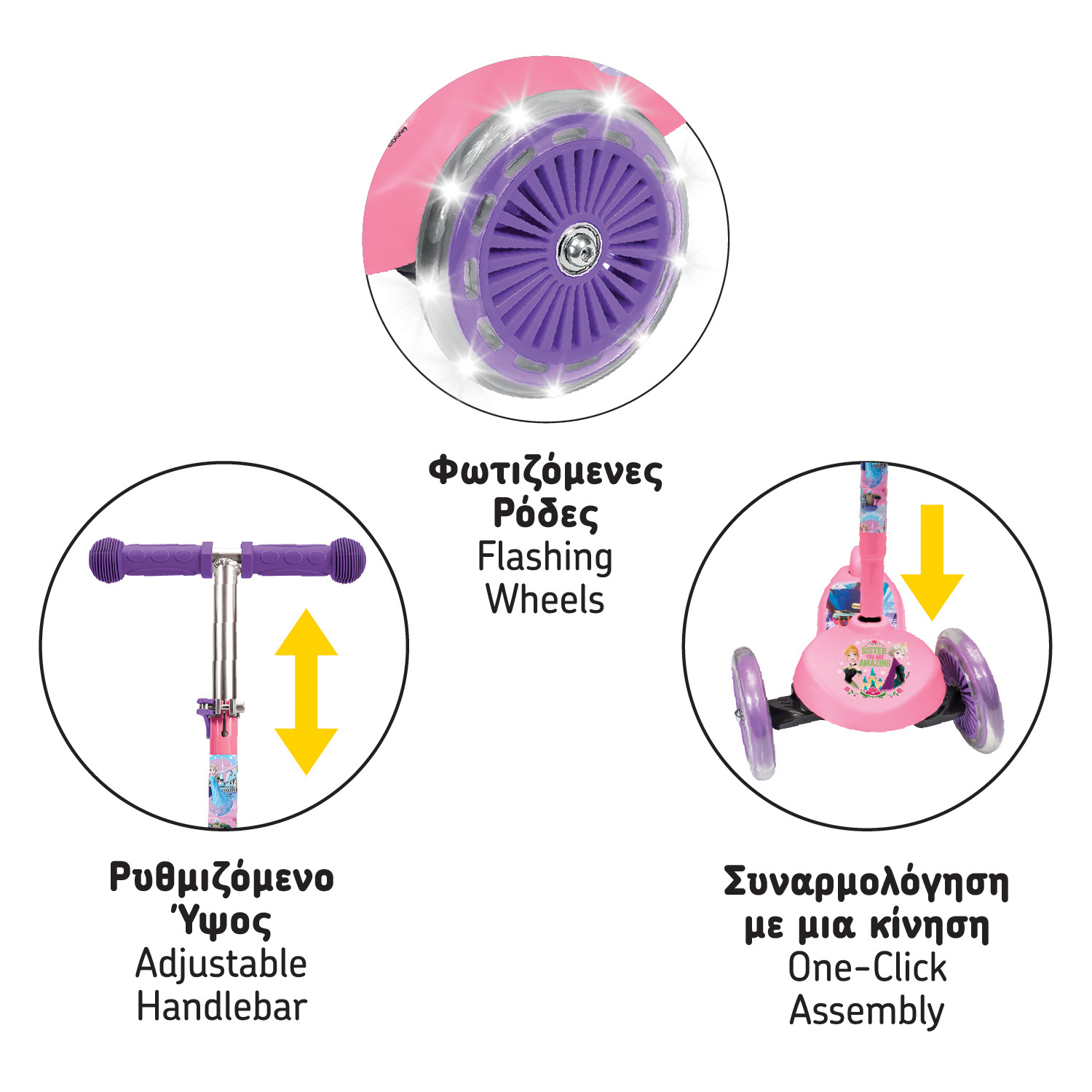 Διαθέτει φωτιζόμενες ρόδες που ενεργοποιούνται με την κίνηση, προσφέροντας εντυπωσιακό οπτικό αποτέλεσμα και αυξημένη ορατότητα. Ο σχεδιασμός με θέμα Frozen, εμπνευσμένος από αγαπημένους χαρακτήρες, το κάνει ιδιαίτερα ελκυστικό για τα παιδιά, ενώ η σταθερή και ανθεκτική κατασκευή του εξασφαλίζει άνεση και ασφάλεια.
