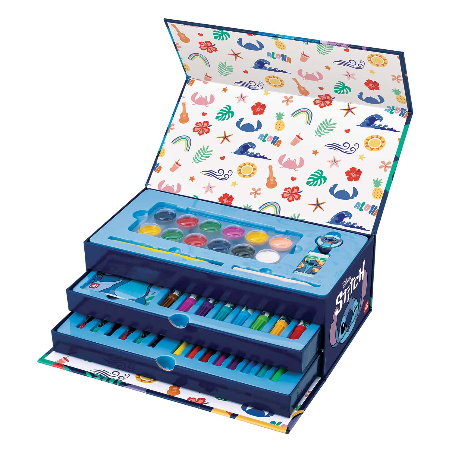 Ένα σετ που περιέχει 50 αξεσουαρ με όλα όσο χρειάζεσαι για να ζωντανέψει ο φανταστικός κόσμος του αγαπημένου σου ήρωα Stitch! Ιδανικό για μικρούς καλλιτέχνες, αυτό το βαλιτσάκι με χερούλι και 3 επίπεδα είναι εύκολο στη μεταφορά για ατελείωτη διασκέδαση με σχέδιο και ζωγραφική. Περιέχει: – 8 μαρκαδόρους – 8 μίνι μαρκαδόρους – 6 ξυλομπογιές – 12 νερομπογιές – 1 πινέλο – 1 μολύβι – 1 σβήστρα – 1 ξύστρα – 11 φύλλα ζωγραφικής