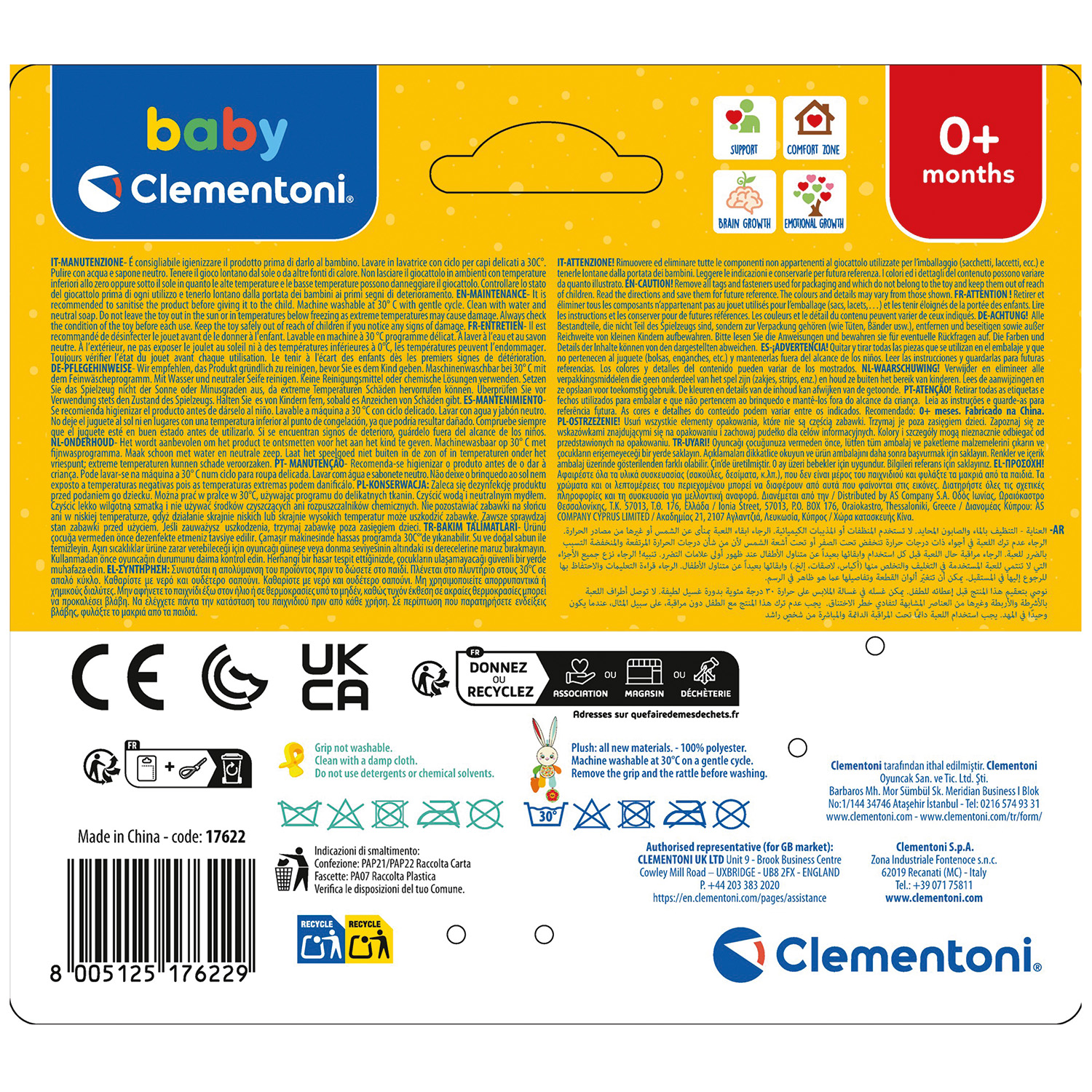 “Ένα λούτρινο για ατελείωτη διασκέδαση εν κινήσει! Σχεδιασμένο για να τραβά την προσοχή των μικρών, μετατρέποντας κάθε διαδρομή σε μια ευχάριστη και δημιουργική εμπειρία. Ιδανικό για τις πρώτες ανακαλύψεις! Με έντονα χρώματα και διαφορετικά μοτίβα, διαθέτει μασητικό στοιχείο, υφές που κάνουν θόρυβο κουδουνάκι και πολλές λεπτομέρειες που διεγείρουν απαλά τις αισθήσεις του μωρού. Εξοπλισμένο με πρακτικό κλιπ, προσαρμόζεται εύκολα στο κάθισμα αυτοκινήτου, στο καρότσι ή όπου αλλού χρειαστεί. Εξαιρετικά μαλακό , εύκολο στο πιάσιμο και στο πλύσιμο, πάντα έτοιμο για χρήση. Τα λούτρινα βόλτας συνοδεύουν το παιδί σε κάθε στιγμή της ημέρας και σε κάθε μετακίνηση. Από τη σειρά Baby Clementoni For You, έχει σχεδιαστεί για να ενισχύει την αισθητηριακή ανάπτυξη, με ποιοτικά υλικά και προσεγμένες λεπτομέρειες. Σχεδιασμένο, μελετημένο και κατασκευασμένο στην Ιταλία. Tα παιχνίδια της σειράς Baby Clementoni βοηθούν τους γονείς να επικοινωνούν και να αλληλεπιδρούν με το μωρό από τις πρώτες ημέρες της ζωής του. Με καινοτόμο σχεδιασμό και χρώματα, μη τοξικά και ανθεκτικά υλικά, καθώς και με ανάγλυφες επιφάνειες και πολλές δραστηριότητες ευνοούν την ανάπτυξη των οπτικών, απτικών και ακουστικών ικανοτήτων, την κινητική δραστηριότητα και τους πρώτους λογικούς συσχετισμούς.”
