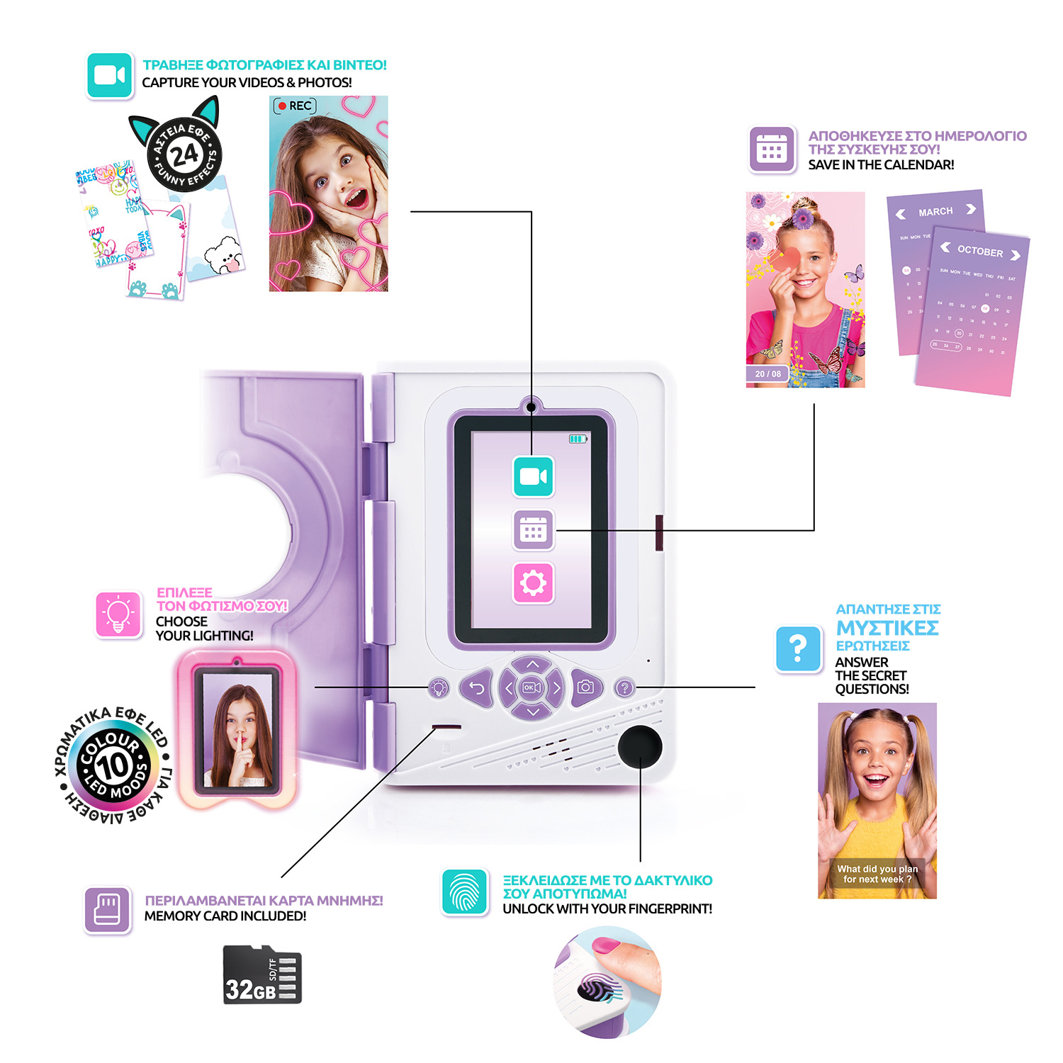 “Κράτησε τα μυστικά σου ασφαλή σε βίντεο με Το Ηλεκτρονικό Ημερολόγιο Secret Creator! Ξεκλείδωσε το ημερολόγιό σου με το δακτυλικό σου αποτύπωμα και κατάγραψε τις καθημερινές σου περιπέτειες σε βίντεο. Δημιούργησε μοναδικά βίντεο Πρόσθεσε διασκεδαστικά φίλτρα που μπορείς να αλλάζεις όσο καταγράφεις. Επιπλέον, τα 10 διαφορετικά LED χρώματα γύρω από την οθόνη δημιουργούν φανταστικά εφέ που μπορούν να αλλάζουν σε κάθε βίντεο! Δακτυλικό αποτύπωμα για απόλυτη μυστικότητα Καταχώρησε και τα 10 δάχτυλά σου και διάλεξε κάθε μέρα διαφορετικό “”κλειδί”” για να ξεκλειδώνεις το ημερολόγιό σου. Νιώσε απόλυτα ασφαλής και κράτησε τα μυστικά σου μόνο για σένα. Αποθήκευση & αναπαραγωγή Όλα τα βίντεό σου αποθηκεύονται με ημερομηνία και μπορείς να τα ξαναδείς όποτε θέλεις. Και αν δεν έχεις σήμερα κάτι να πεις, μπορείς απλά να τραβήξεις φωτογραφίες ή να απαντήσεις σε μια από τις ερωτήσεις που έχει για σένα το ημερολόγιό σου. Ασταμάτητη διασκέδαση Με επαναφορτιζόμενη μπαταρία, το Video Diary σε ακολουθεί όπου κι αν πας χωρίς να σε σταματά τίποτα! Περιεχόμενα συσκευασίας: – 1 Ηλεκτρονικό βίντεο ημερολόγιο – 1 Κάρτα SD 32GB – 1 Καλώδιο USB-C – Αυτοκόλλητα – 1 Εγχειρίδιο Χρήσης”