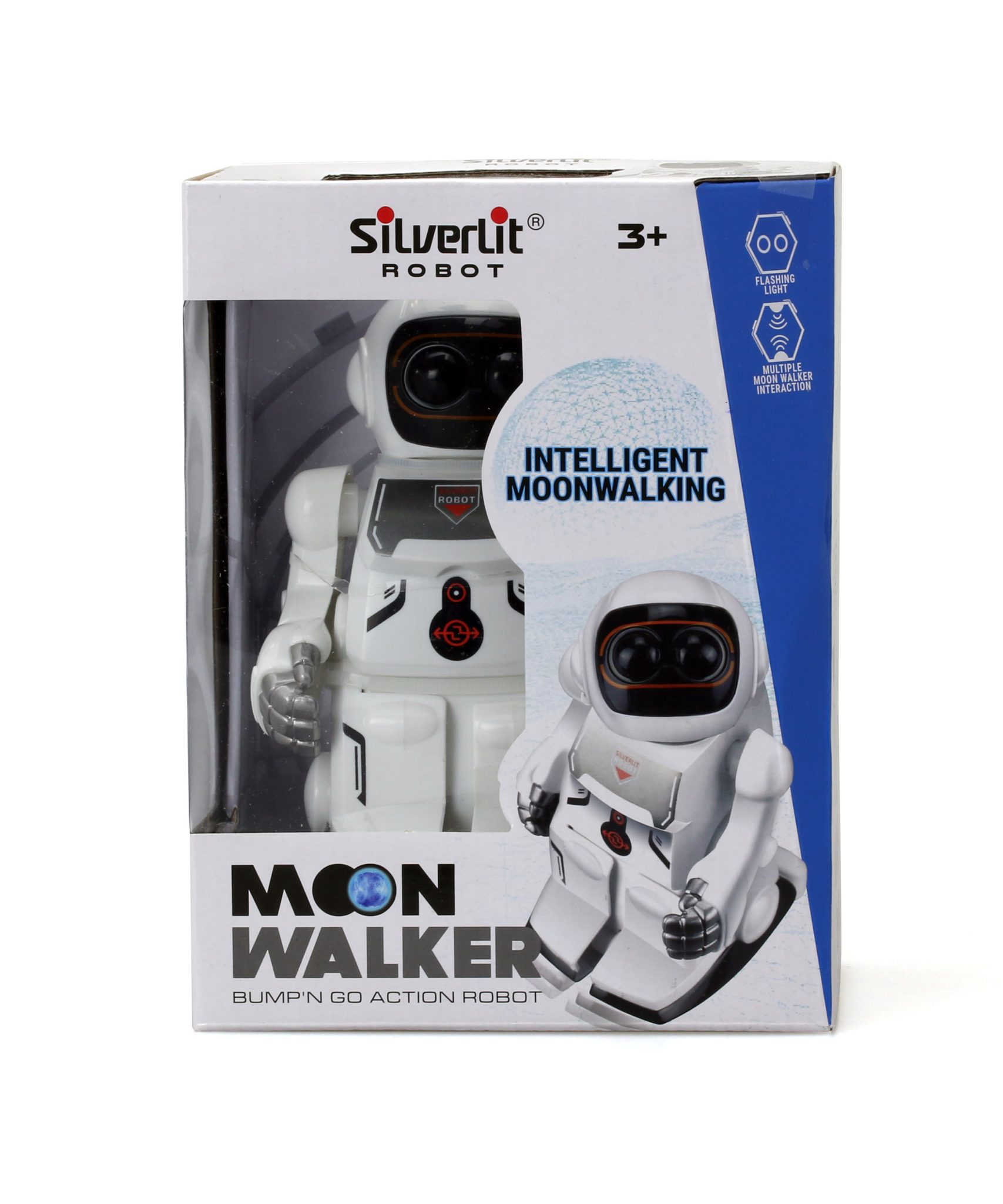 Το ηλεκτρονικό ρομπότ Moonwalker μπορεί να περπατάει προς τα εμπρός κουνώντας τα χέρια και τα πόδια του και κουνάει το κεφάλι του, το οποίο φωτίζεται κιόλας. Λειτουργεί με 2 μπαταρίες AA (δεν περιλαμβάνονται).